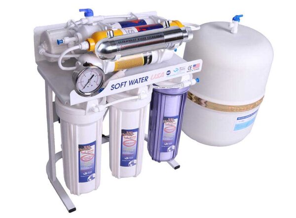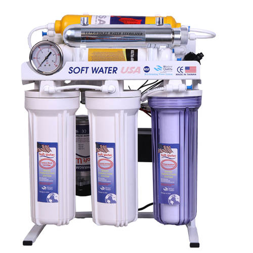 دستگاه تصفیه آب سافت واتر soft water یک برند قدیمی و شناخته شده و معتبر و پیشترفته ترین و حرفه ای ترین دستگاه تصفیه آب خانگی با فناوری سیستم تصفیه اشعه فرابنفش + قلیایی کننده آب + اسمز معکوس میباشد (RO+UV+ORP) که در 8 مرحله و 8 فیلتر آب را تصفیه میکند که شامل فیلتر های PP + UDF + CTO + MEMBRANE + POST CARBON + MINERAL + ORP + UV همراه با مخزن ذخیره آب 4 گالن ، فیلتر ممبران 13 لایه 75 گالن آمریکا ، بهترین فیلتر اشعه فرابنفش (UV) ، هوزینگ های دوبل اورینگ برای آب بندی بهتر و با قدرت گرفتن کلیه ناخالصی های آب تا 0/0001 میکرون و پایین آوردن سختی آب (TDS) و نیترات و نیتریت و تنظیم PH آب و بالغ بر99.99 درصد از ویروس های در آب را از بین میبرد.